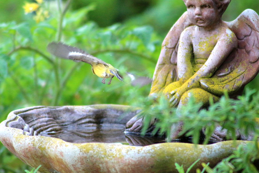 While doing the morning dishes and looking out the back window lately, I am entertained by the sight of finches using our bird bath. One recent morning, I grab my camera, stealthily creep out to the backyard and stage myself close enough to hopefully allow for an action shot of the activities. Sitting as still as possible with camera poised I wait. . . and wait; for a half an hour, at least, I wait and not one bird comes close to taking a dip. A few days later, still determined to capture the activities, I venture out again. This time trying a new location a little farther away and armed with a 100mm-300mm zoom lens. About fifteen minutes in, my mind begins wandering. Thinking back, many years ago, to when we purchased the bird bath and one of the backyard daughters, Michele, was about four years old. We lugged it out to the carefully chosen spot in the garden, placed it in the dirt wiggling and maneuvering it back and forth to level it and filled the bowl with water. Michele was excited about the new addition to the backyard and couldn’t wait for the first visitors to arrive for a bath. “How will they know it’s here?” she queried. I assured her the birds would be able to find it but she decided to help out and rode around the backyard on her pink bicycle with training wheels and streamers hanging from the handlebars shouting, every few seconds, “Birdbath! . . . Birdbath!” Unfortunately, it had the opposite of the desired effect and eventually we decided to wait and watch from inside the house. Sitting there in the yard, warmed by the sun and the fond memory, I waited once again. This time there were a few birds but they seemed to distrust me and kept their distance and a watchful eye on me and the bird bath.